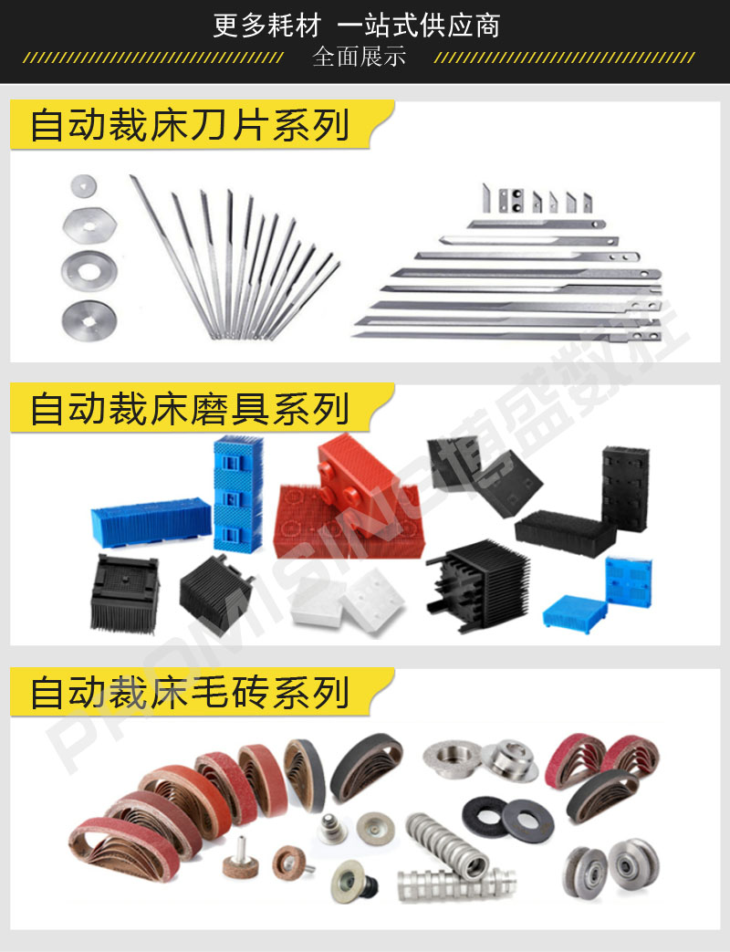 公司同时还供应适用上述品牌自动裁床的耗材(裁刀刀片、磨刀石砂轮砂带)及相关零配件:鬃毛砖、棕毛砖、刚毛砖、钢毛砖、刚毛、棕毛刷、鬃毛刷、毛刷、毛砖、裁刀刀片、磨刀砂轮等裁床配件零部件。